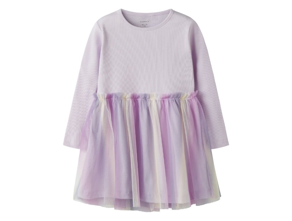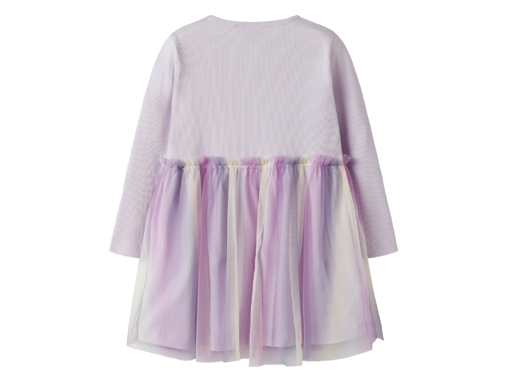 Kjole i lilla nuance (Lavender Fog) fra Name It med ribstrikket overdel og tylskørt i flere lyse nuancer.