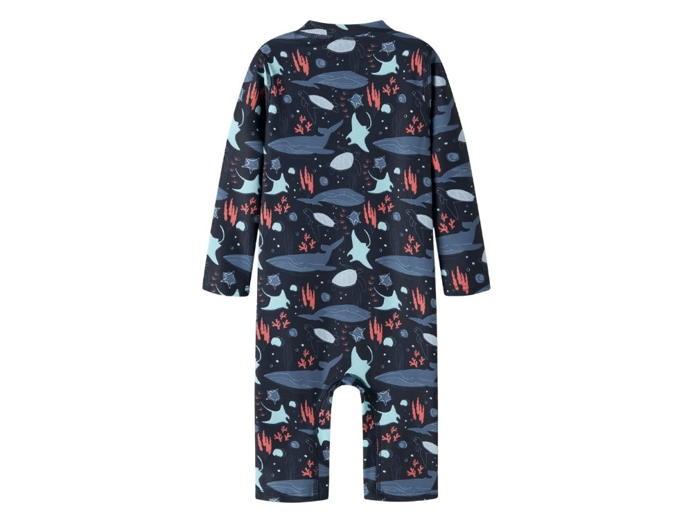 UV badedragt i mørkeblå nuance (Navy Blazer) fra Name It med allover print af havdyr som hvaler, rokker, skildpadder og søstjerner.