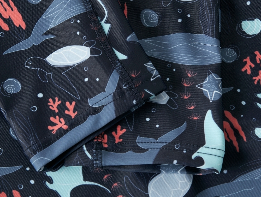 Badedragten har lange ærmer, korte ben og lynlås foran, som gør den nem at tage af og på. Materialet er let og hurtigtørrende og designet til at give ekstra beskyttelse mod solens stråler under leg i vandet.