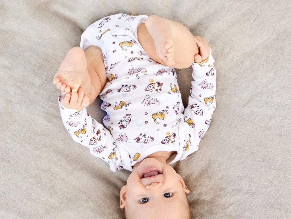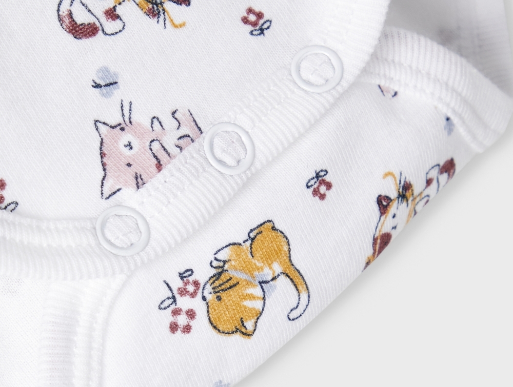 Den lilla body er ensfarvet mens de to hvide bodyer har katte-print.