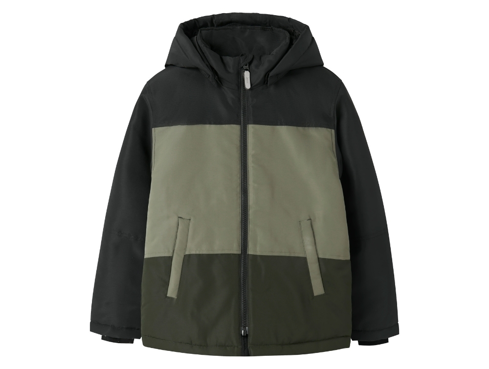 Jakken fra Name It i dusty olive er designet med farveblokke i grønne nuancer og sort.
