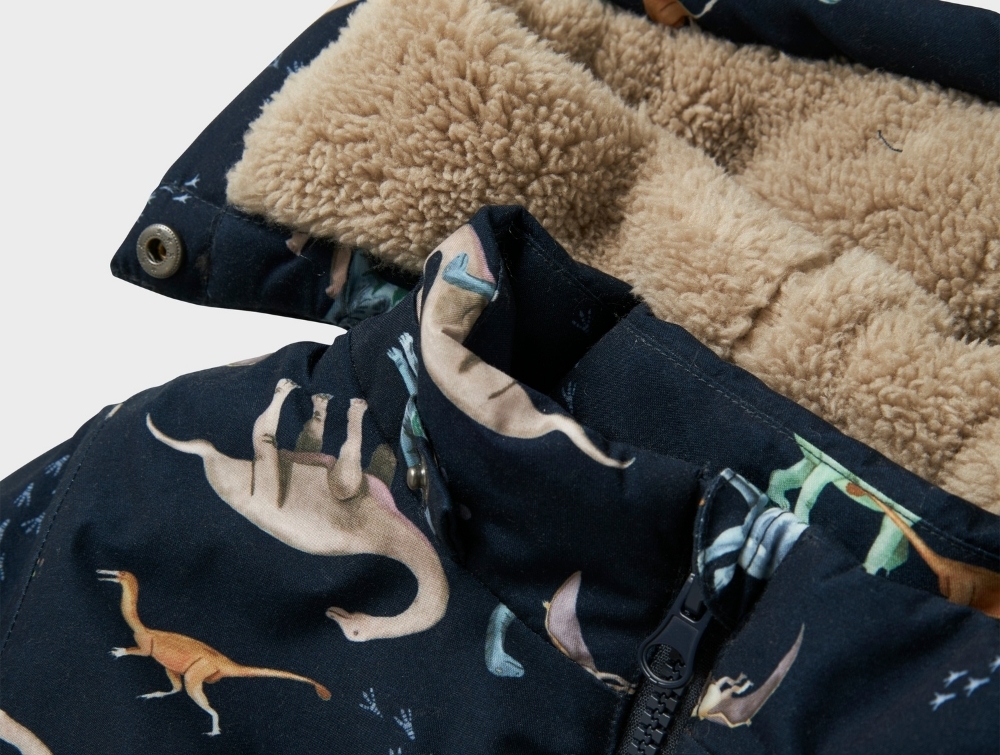 Mørkeblå (dark sapphire) vinterjakke med dinosaurprint fra Name It.