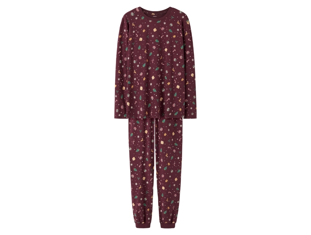 Voksenpyjamas i bordeaux rød nuance (burgundy) med juleprint fra Name It.
