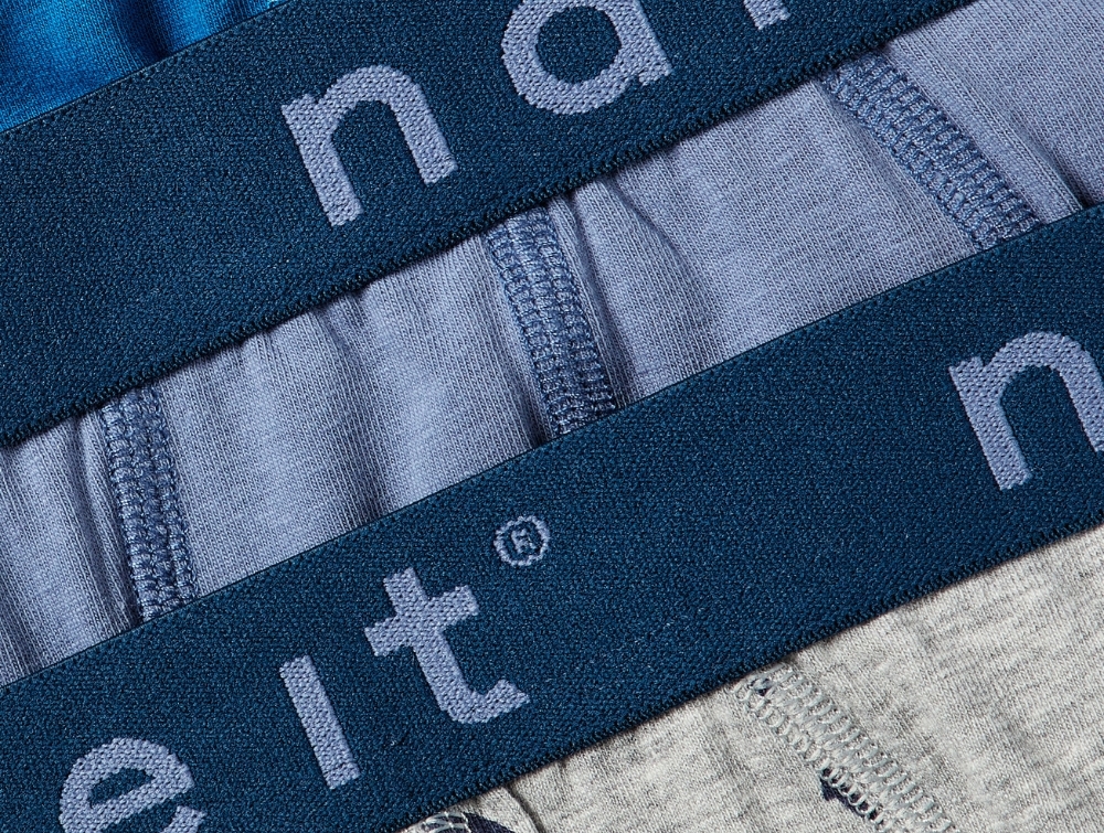 Pakken indeholder to par ensfarvede underbukser i blå nuancer samt et par grå underbukser med print.