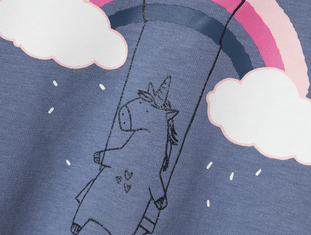 Langærmet top i farven wild wind med regnbue og enhjørning på gynge fra Name It.