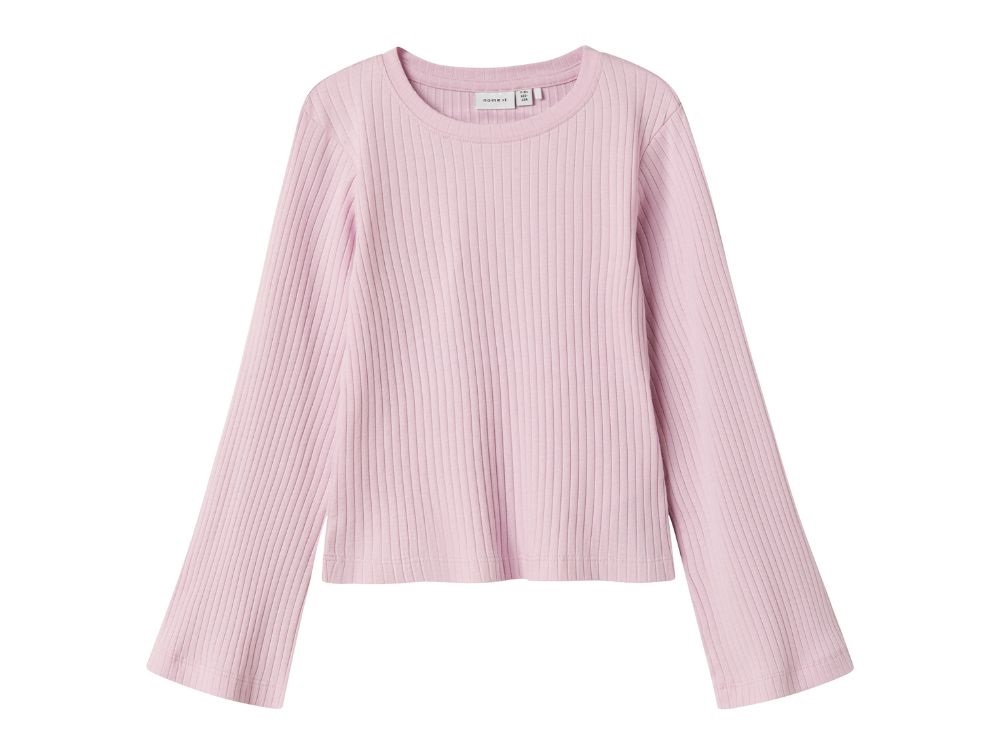 Kort lyserød top fra Name It i rib med lange trompetærmer.