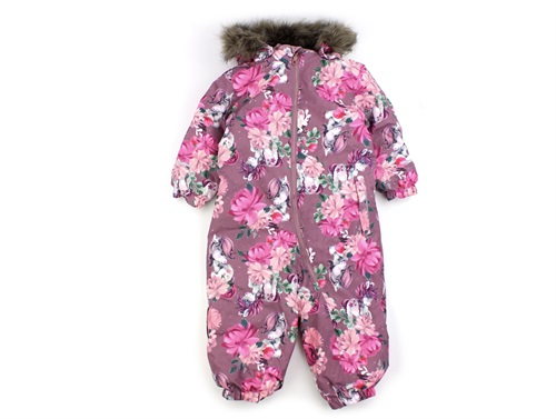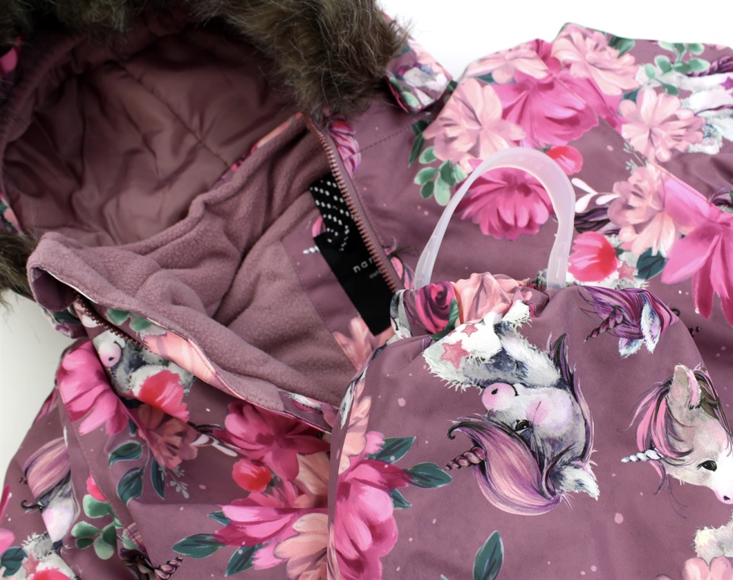 Flyverdragt i farven wistful mauve med blomster- og enhjørningprint fra Name It. Flyverdragten har en aftagelig hætte med faux fur og trykknapper.