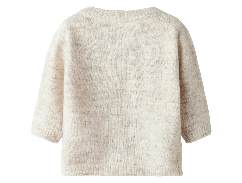 Baby cardigan i meleret beige/hvid nuance (peyote melange) fra Name It med knapper og blondekant foran.