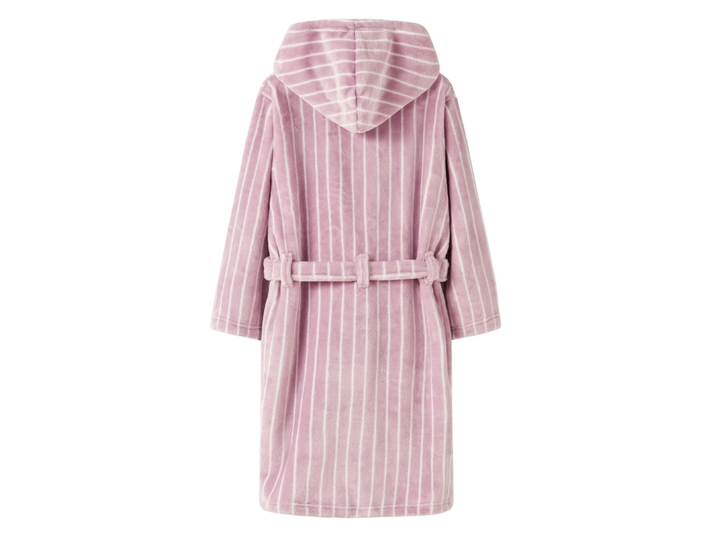 Kåben er fremstillet i blød velour med striber, der giver en fin struktur og et elegant skær. Den har hætte, trykknaplukning foran og fastsyet bindebælte i taljen for en god og sikker pasform.