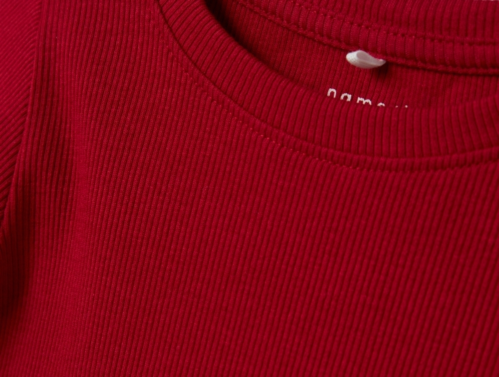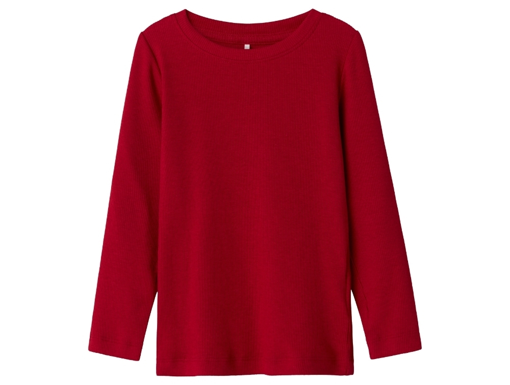 Barn i rød Name It top med lange ærmerName It top jester red med lange ærmerDetalje af ribstrikket rød top fra Name ItBagside af jester red top fra Name It med lange ærmer