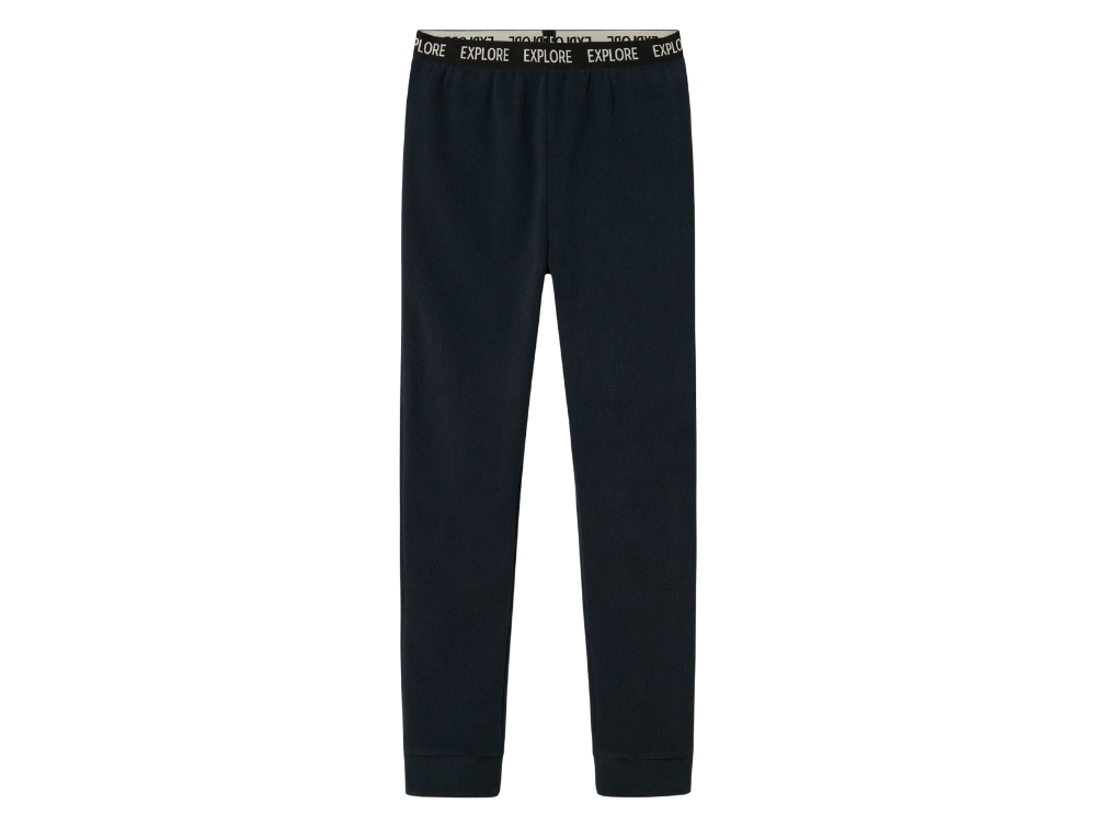 Jakken har lynlåslukning med et blødt stofstykke bag lynlåsen, som beskytter huden mod at blive klemt. Den har elastiske manchetter og en høj krave for ekstra komfort. Bukserne har elastik i taljen med "EXPLORE"-tekst og elastiske benåbninger for en god pasform.