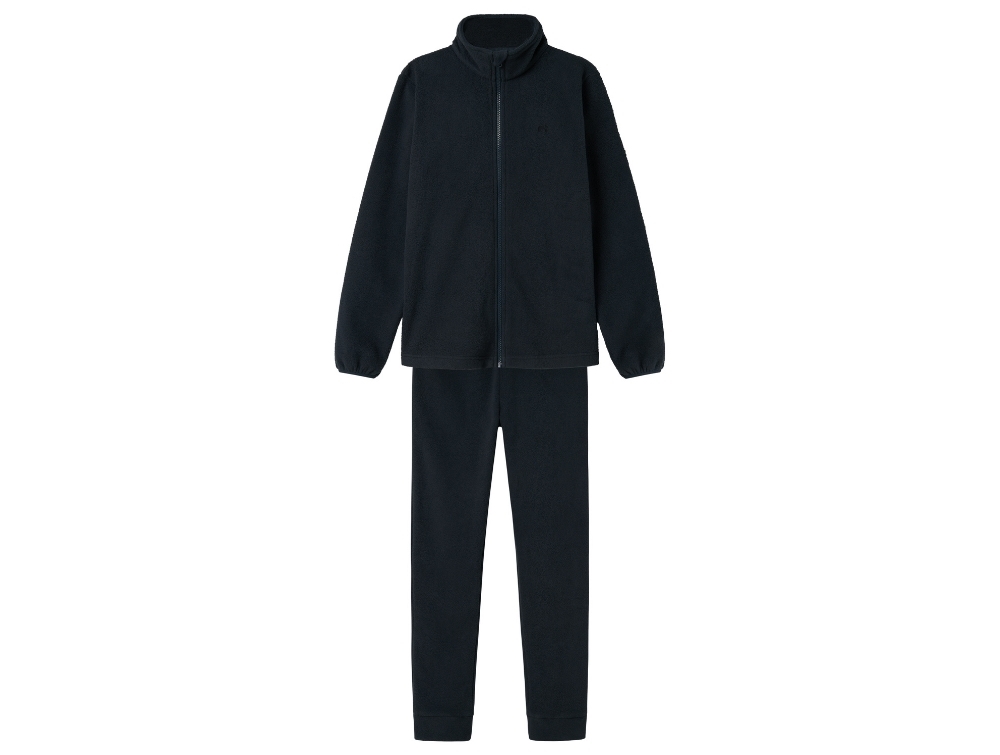 Sættet består af jakke med lynlås og bukser i blødt polyesterfleece.