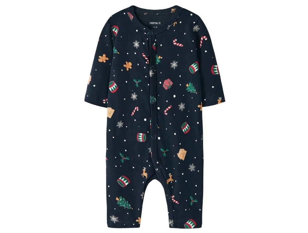 Natdragt i mørk blå nuance (navy blazer) fra Name It med all-over juleprint af rensdyr, trommer, juletræer og kagemænd.