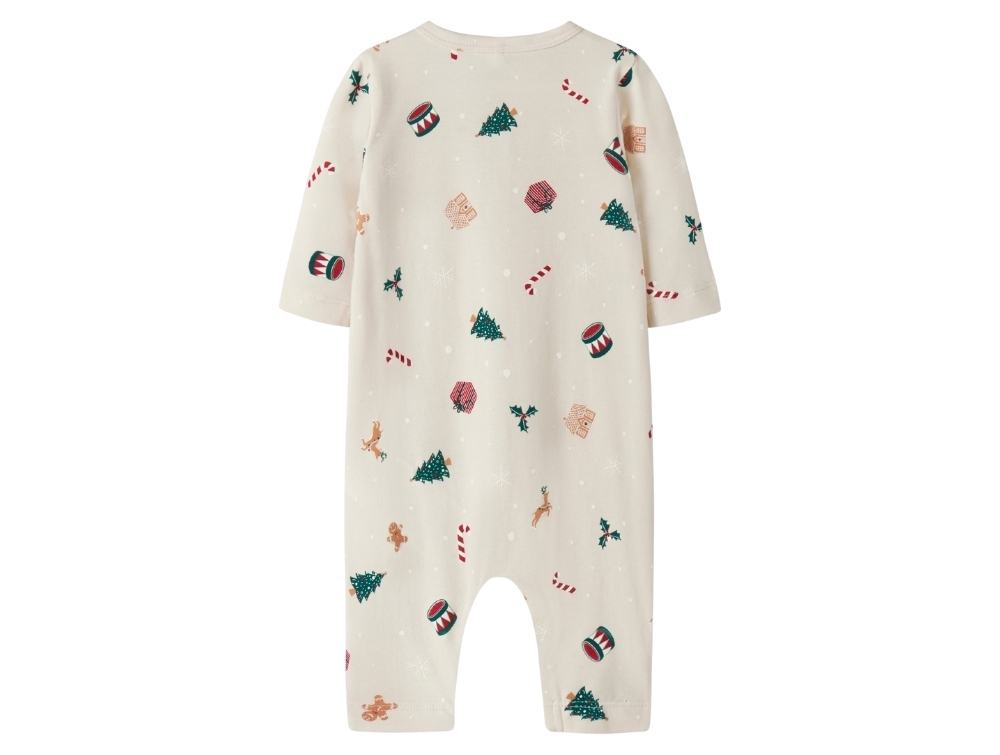 Natdragt i råhvid nuance (whitecap gray) fra Name It med all-over juleprint af rensdyr, trommer, juletræer og kagemænd.