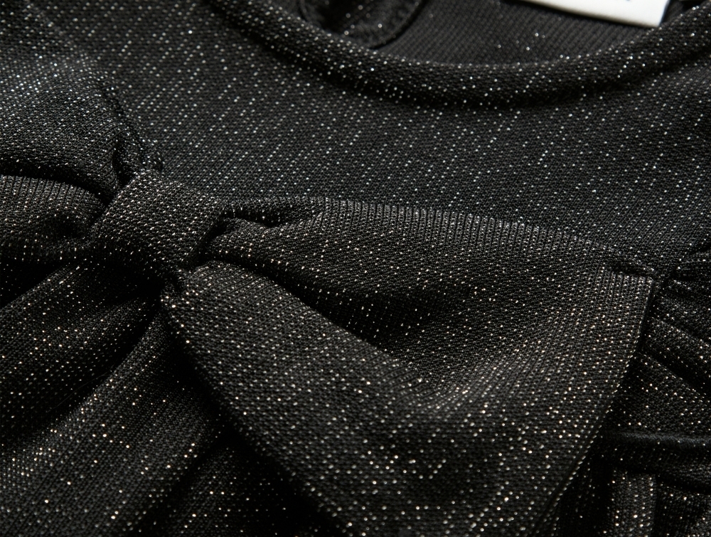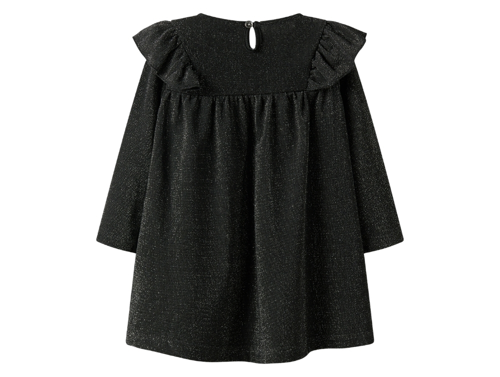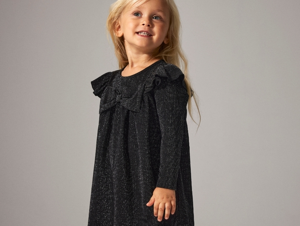 Pige i sort glimmerkjole fra Name It med sløjfedetaljeName It kjole i sort med glimmer og sløjfe set forfraDetalje af sløjfe og glimmer på sort Name It kjoleBagside af sort glimmerkjole fra Name It med flæser