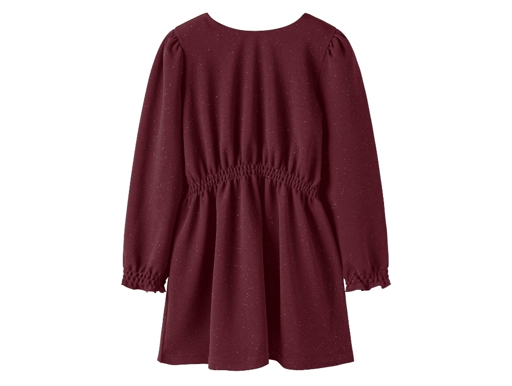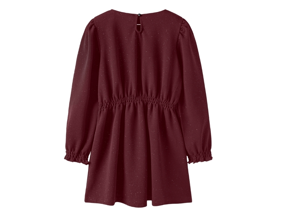 Kjole i bordeaux rød nuance (burgundy) fra Name It med fine glimmerdetaljer vævet ind i stoffet.