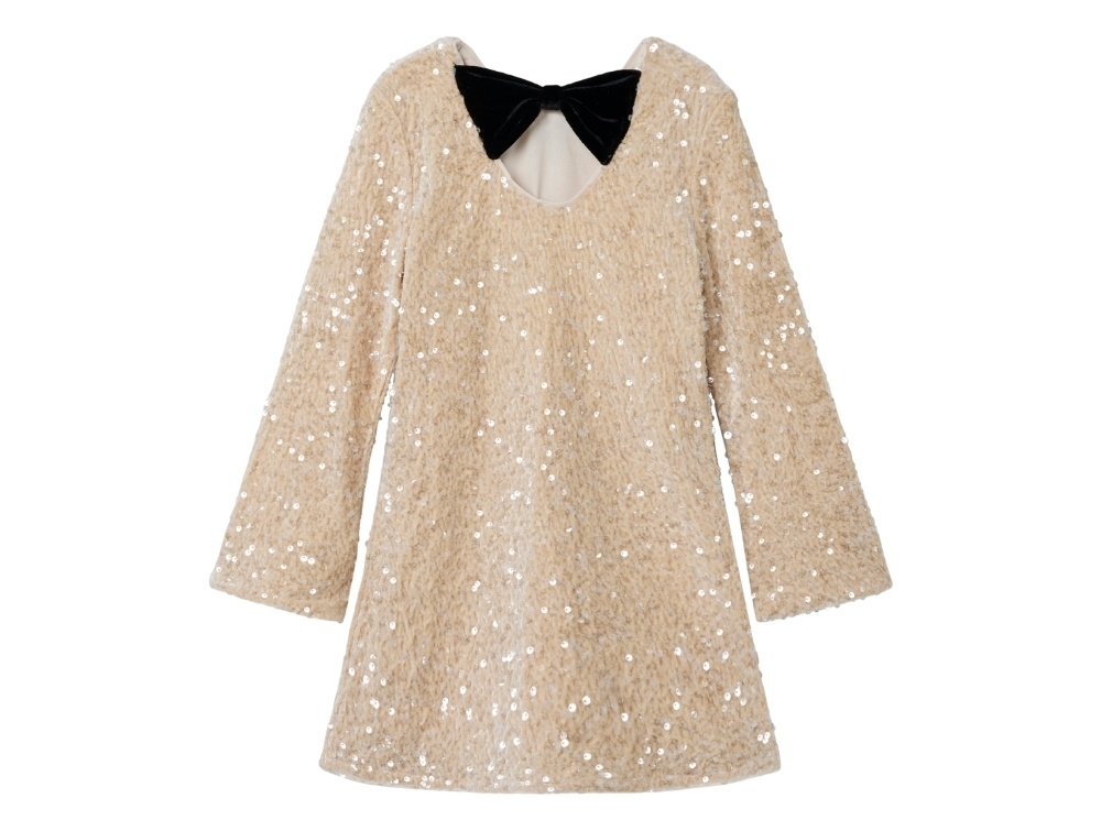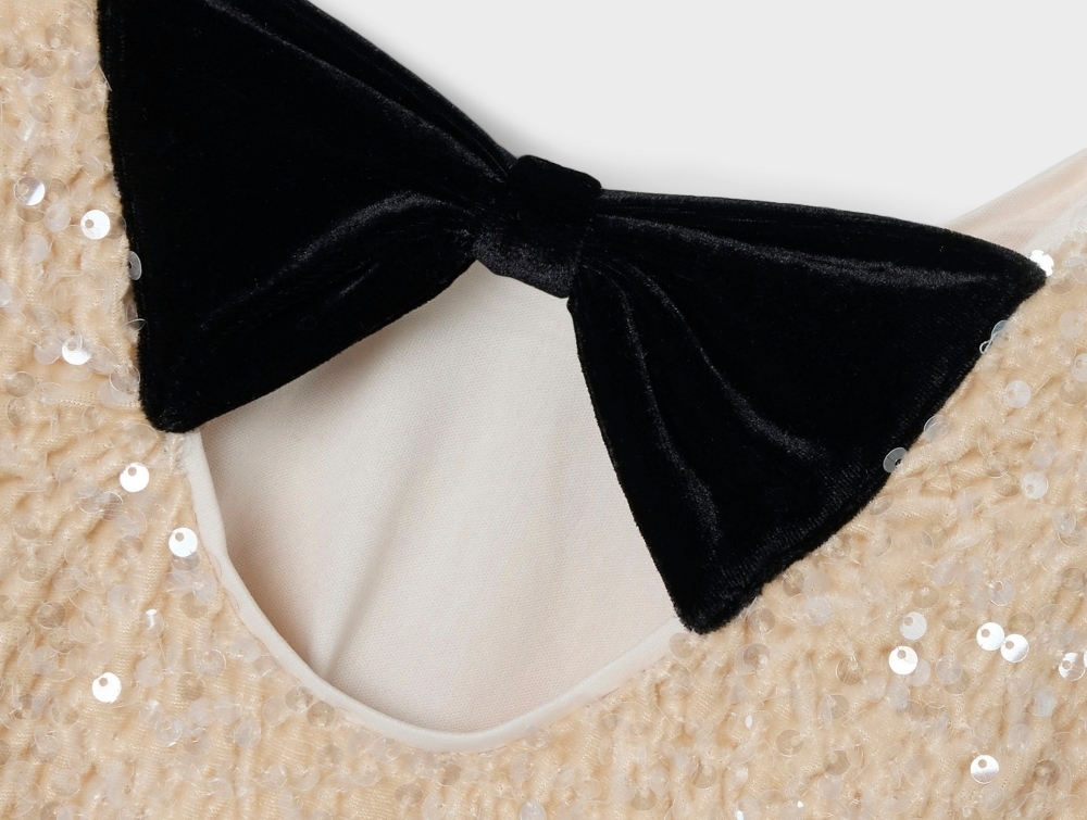 Pige iført Name It pailletkjole jet streamName It kjole jet stream med pailletter og sort sløjfeDetalje af sort sløjfe på Name It kjole jet streamName It pailletkjole jet stream set bagfra