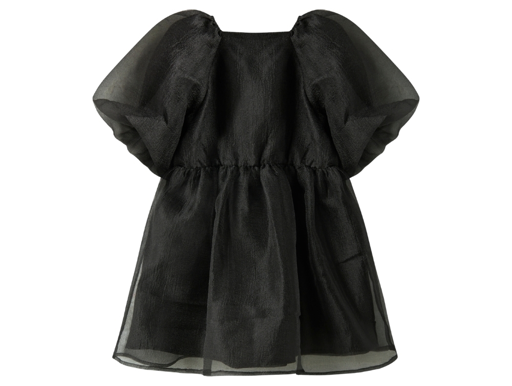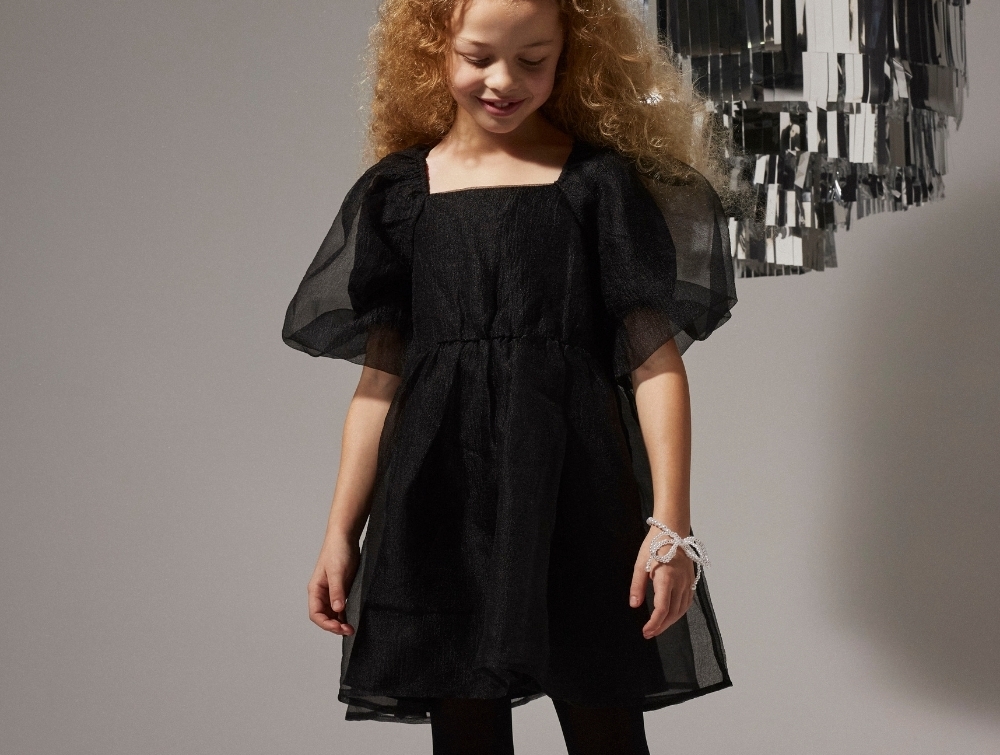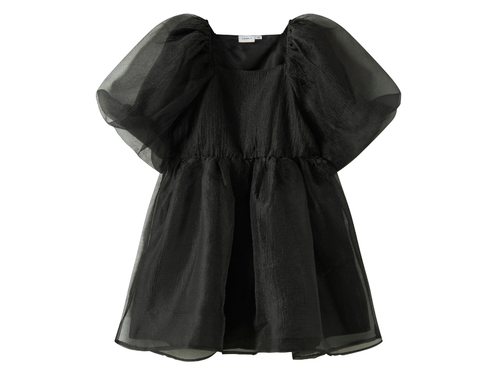 Let og elegant kjole i sort chiffon fra Name It med puffærmer og firkantet halsudskæring.