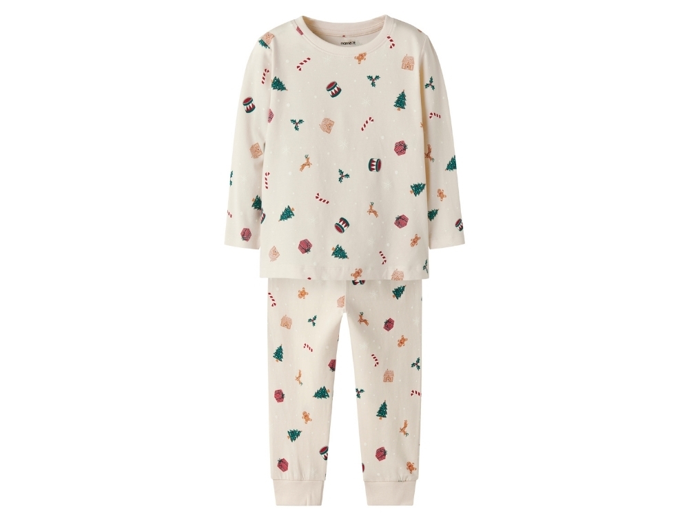 Pyjamas i råhvid nuance (whitecap gray) fra Name It med all-over juleprint af rensdyr, trommer, juletræer og kagemænd.