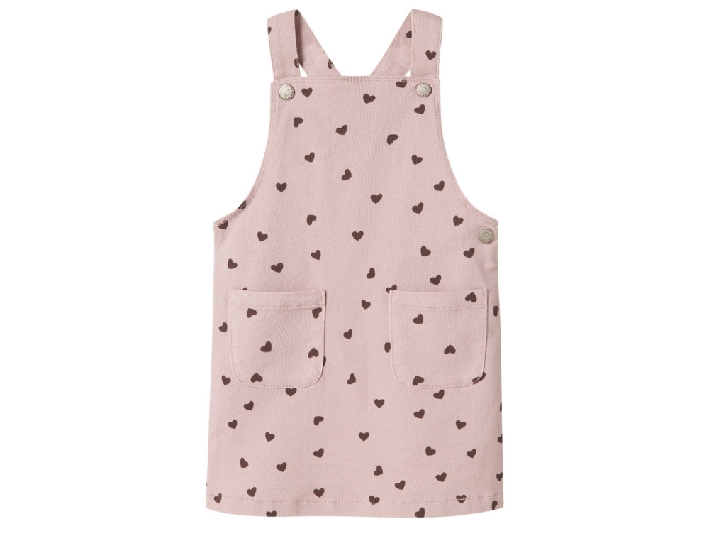 Spencerkjole i rosa nuance (burnished lilac) fra Name It med sødt hjerteprint over det hele. Kjolen har justerbare seler med trykknapper og to forlommer, som giver et klassisk og funktionelt udtryk.