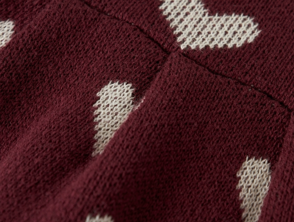 Name It strikkjole burgundy med hjerteprintDetalje af strikket materiale med hjerter på kjole fra Name ItBagside af Name It strikkjole burgundy med hjerteprint