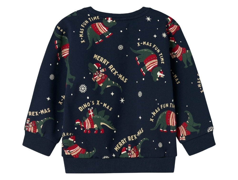Name It sweatshirt navy blazer med dinosaur juleprintDetalje af dinosaur juleprint på navy sweatshirt fra Name ItBagside af navy sweatshirt fra Name It med juleprint af dinosaurer