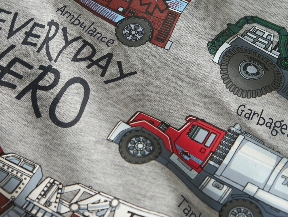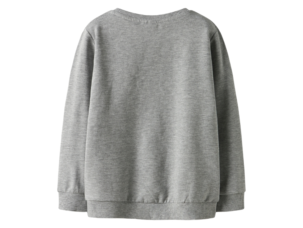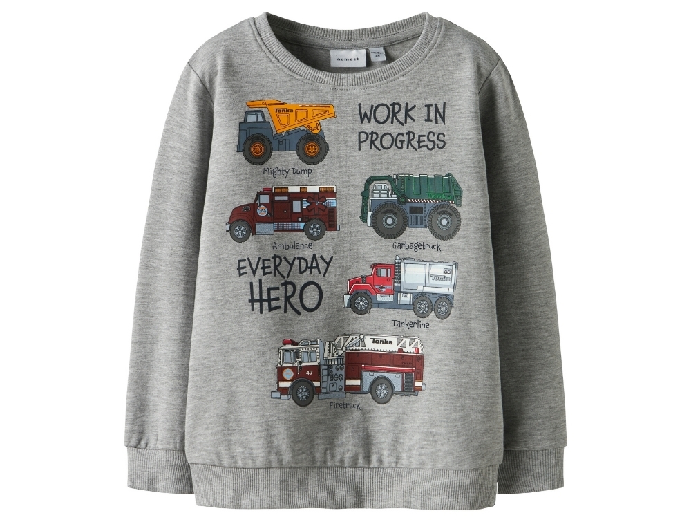 Sweatshirt i grå melange fra Name It med farverigt Tonka bilprint foran.