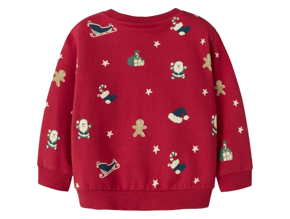 Name It sweatshirt jester red med juleprintBarn i rød Name It sweatshirt med juleprintDetalje af juleprint på rød sweatshirt fra Name ItBagside af rød Name It sweatshirt med juleprint