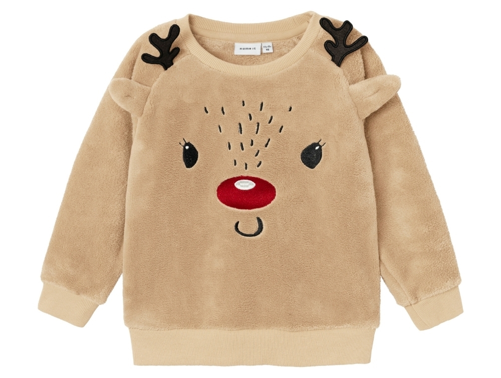 Sweatshirt i beige nuance (peyote) fra Name It med rensdyrmotiv på forsiden, inklusive broderede detaljer, rød næse og små 3D-ører samt gevirer.