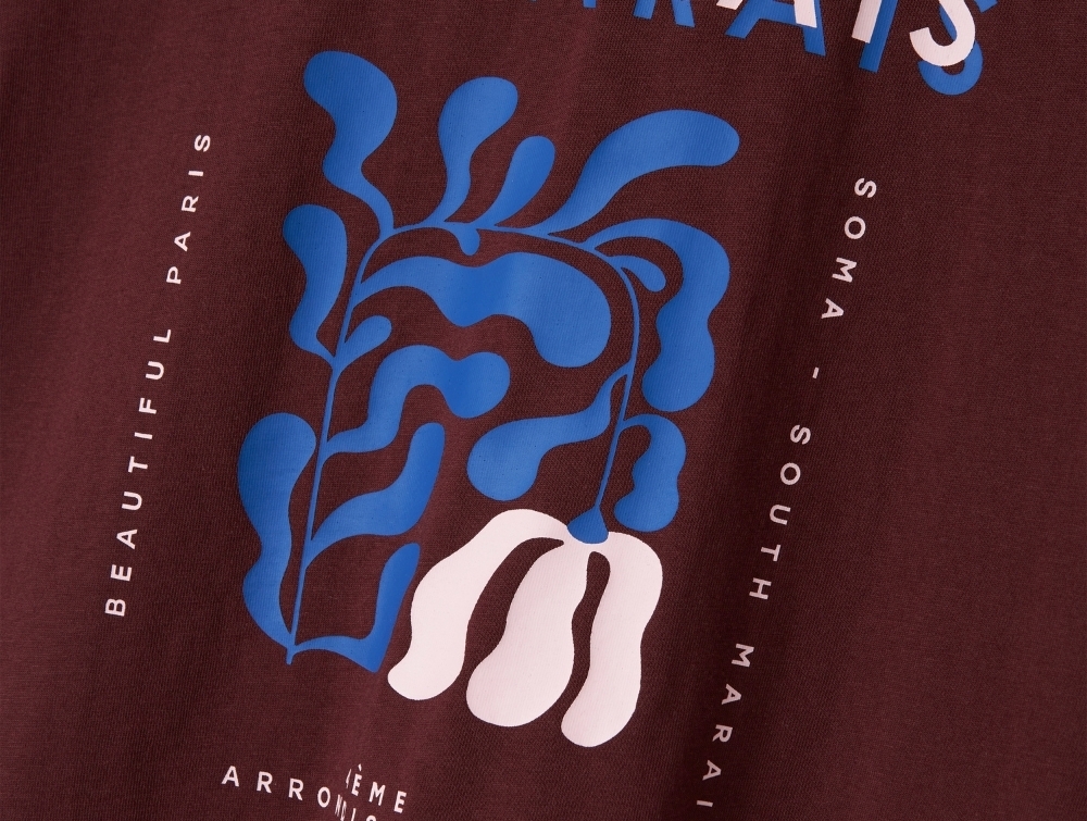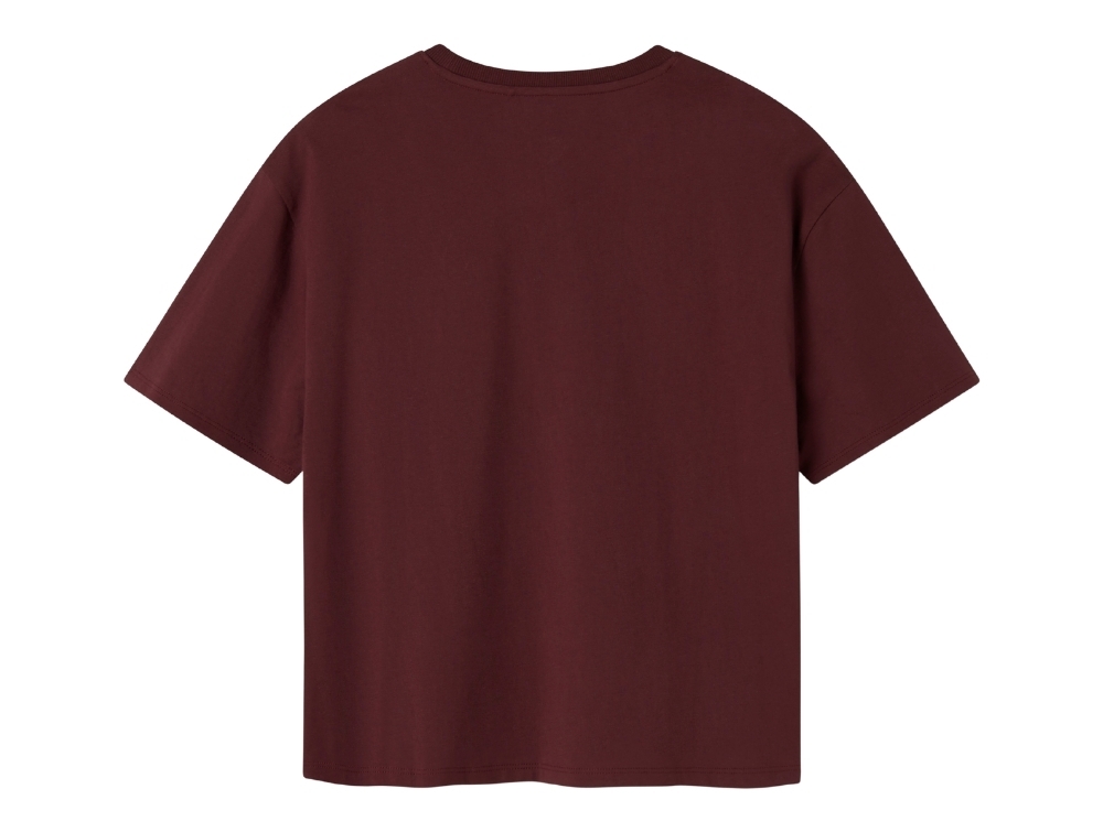 T-shirt i bordeaux rød nuance (sassafras) fra Name It med stort "Le Marais"-print foran i blå og hvide nuancer.