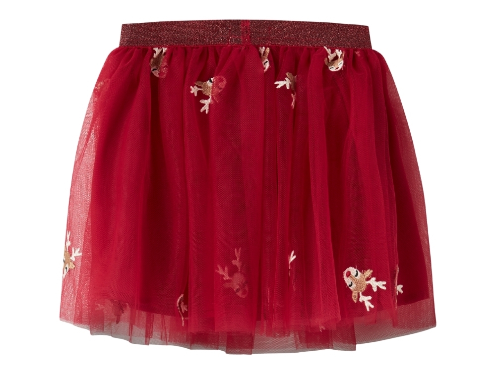 Tylskørt i rød nuance (jester red) fra Name It med broderede rensdyr og glitrende elastik i taljen.