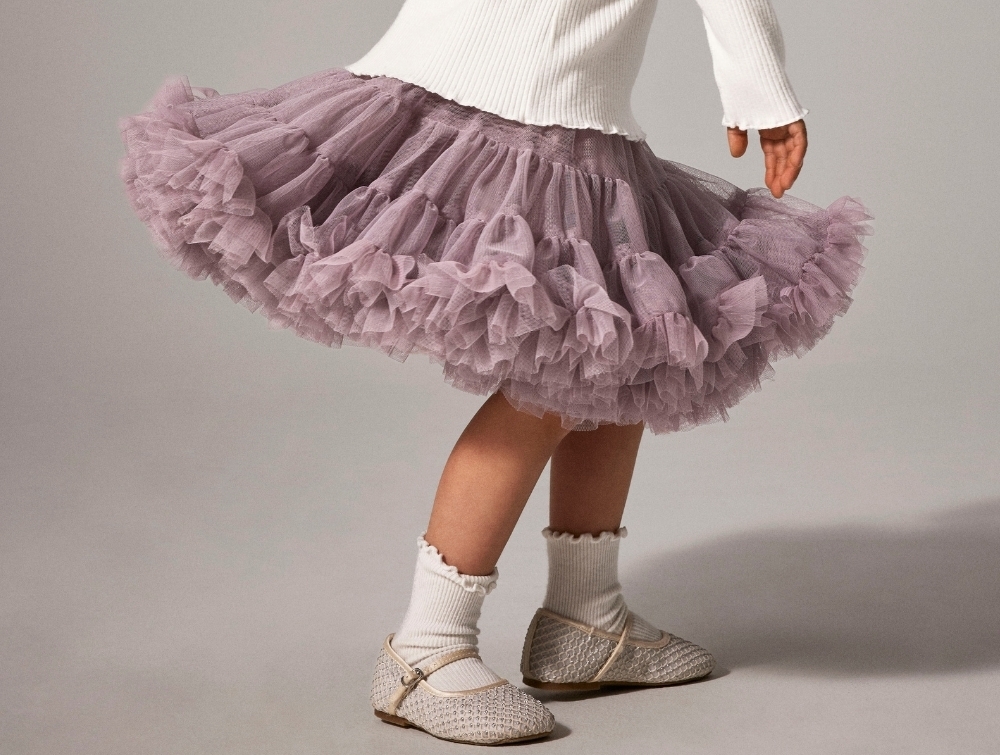 Fremstillet i let tyl med polyesterfor, som sikrer at skørtet ikke er gennemsigtigt. Et festligt valg til særlige lejligheder.