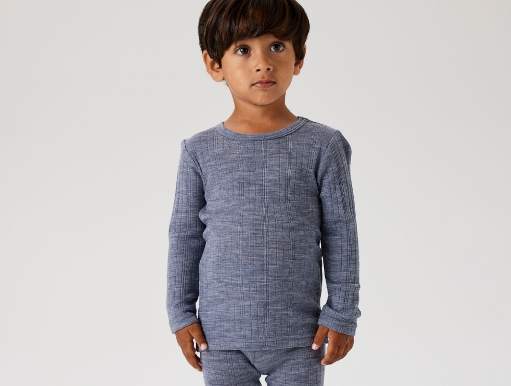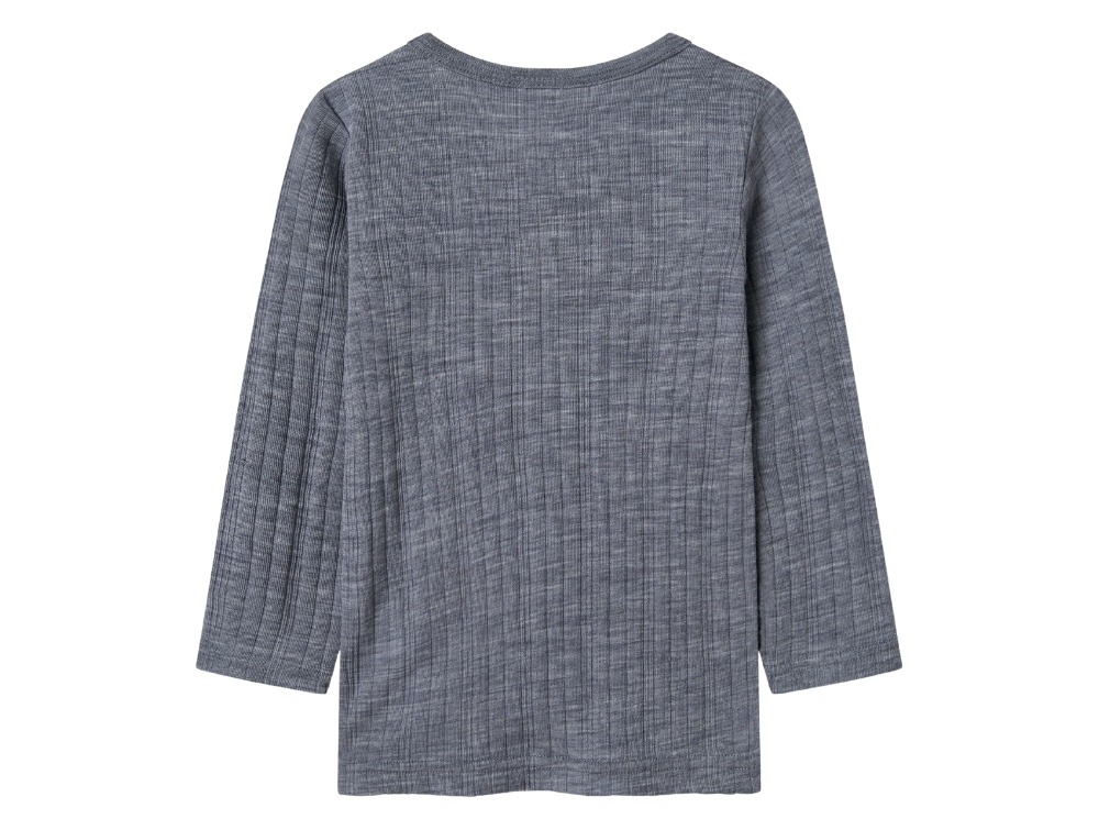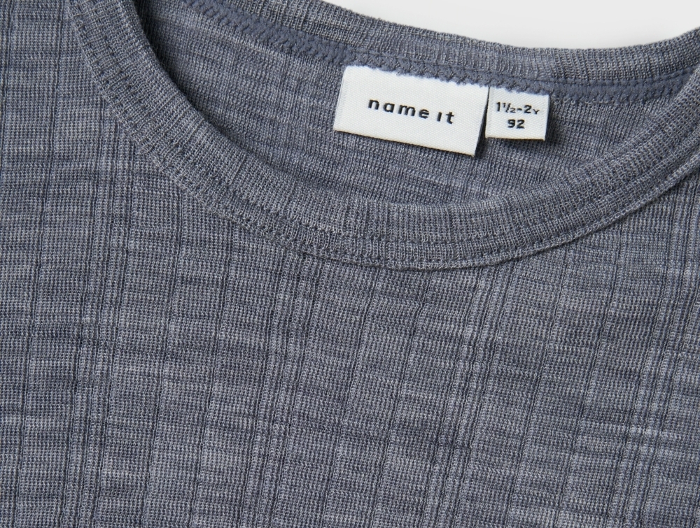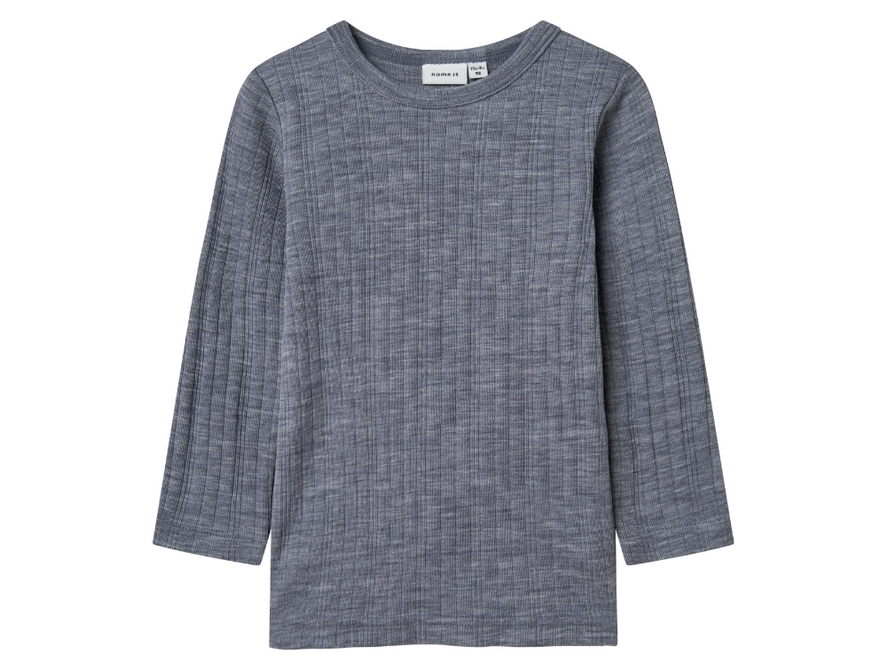 Name It uld bluse i folkstone gray merinould med ribstrukturBarn iført Name It uld bluse i folkstone grayDetalje af Name It uld bluse i folkstone gray med rund halsBagside af Name It uld bluse i folkstone gray med ribstruktur