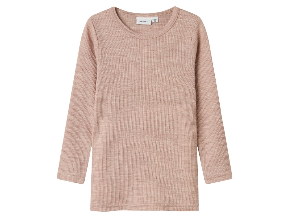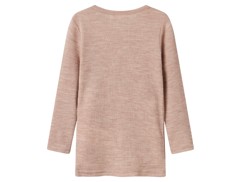 Pige iklædt Name It uld bluse i støvet rosa nuance shadow gray med ribstrukturName It uld bluse i støvet rosa nuance shadow gray med ribstrukturDetalje af Name It uld bluse i shadow gray med rund halsBagside af Name It uld bluse i støvet rosa nuance shadow gray
