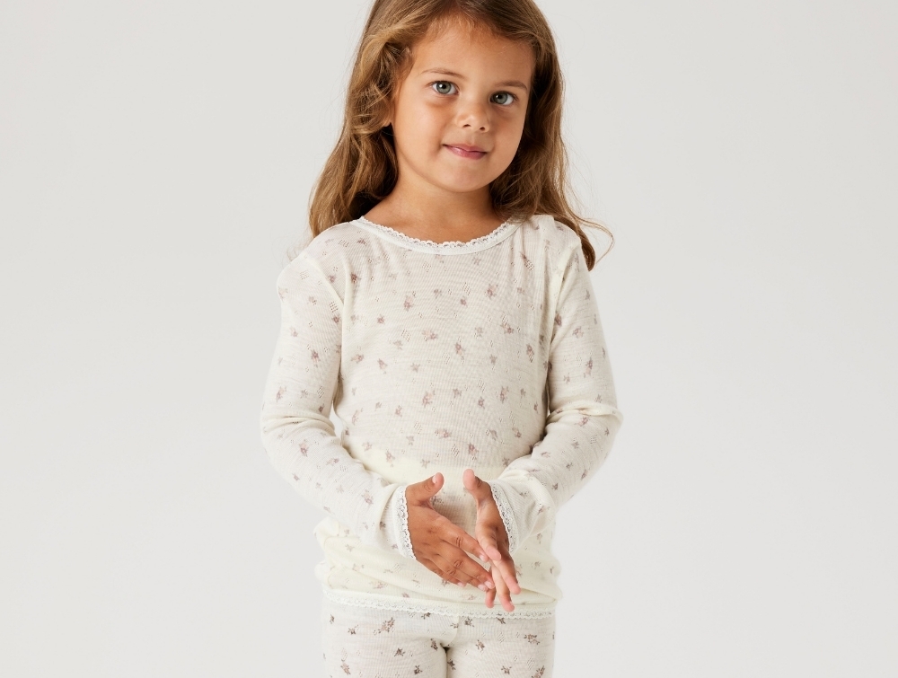 Barn iført Name It uld bluse i snow white med blomsterprintName It uld bluse i snow white merinould med blomsterprint og hulmønsterDetalje af Name It uld bluse i snow white med blondekantBagside af Name It uld bluse i snow white med blomsterprint og hulmønster