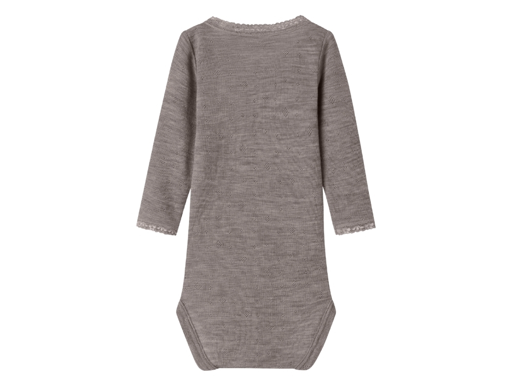 Name It body i grå-brun merinould med hulmønster og blondekant