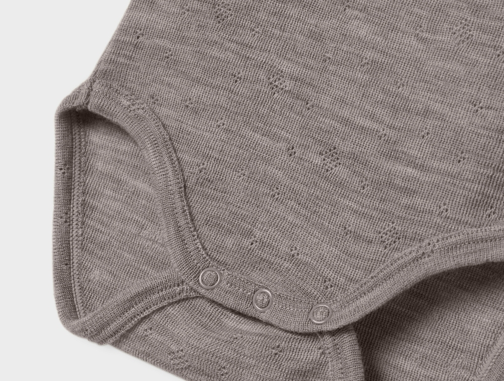 Bodyen er fremstillet i blød merinould med hulmønster og har fine blondedetaljer ved hals og ærmer. Trykknapper i bunden gør det nemt at skifte.