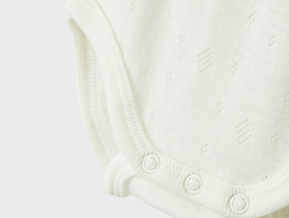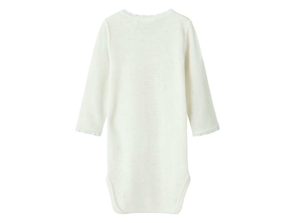 Name It uld body i snow white merinould med hulmønster og blondekantDetalje af Name It uld body i snow white med trykknapperBagside af Name It uld body i snow white merinould