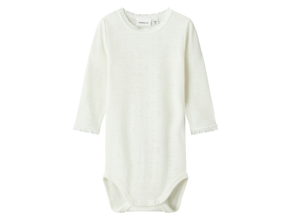 Name It body i råhvid merinould med hulmønster og blondekant