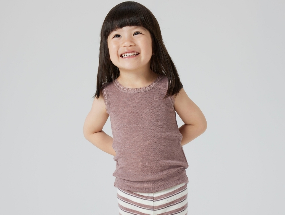 Barn iført Name It uld undertrøje i antler merinouldName It uld undertrøje i antler merinould med hulmønster og blondekantDetalje af Name It uld undertrøje i antler med blondekant