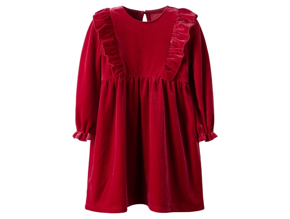 Kjole i rød nuance (jester red ) fra Name It i blød velour med flæser foran.