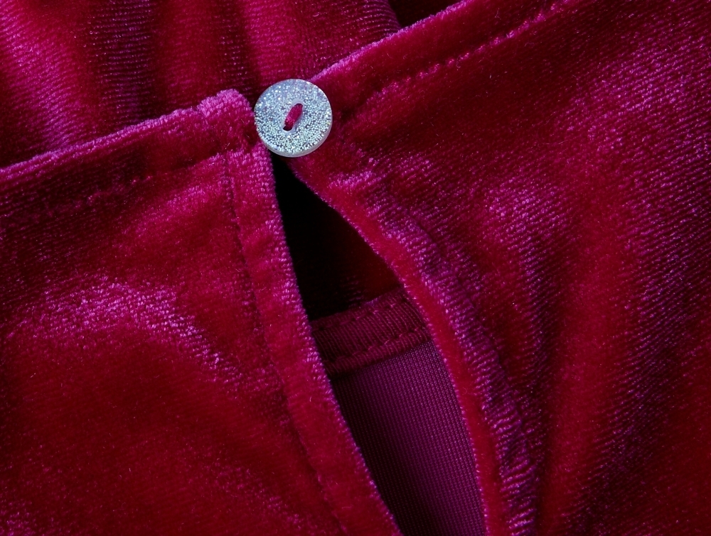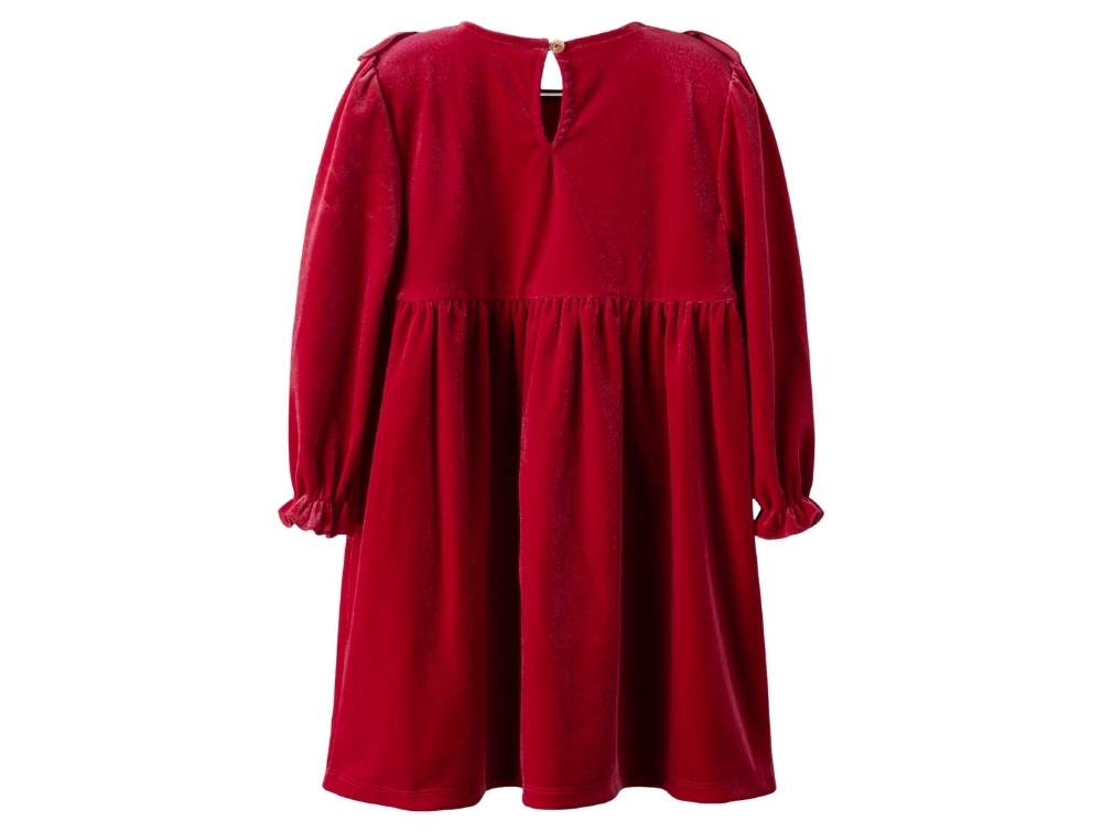 Velour giver en glansfuld overflade med bløde fibre, der følger hånden, hvilket tilføjer en fin struktur. Kjolen er velegnet til særlige lejligheder i juletiden og giver et festligt udtryk.