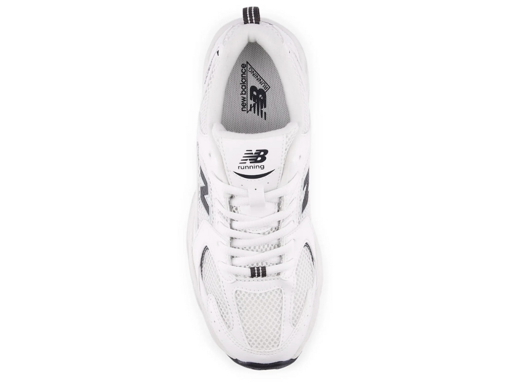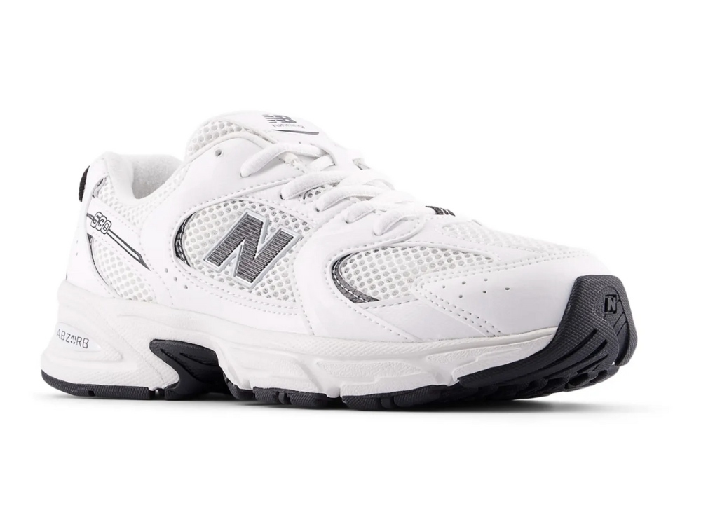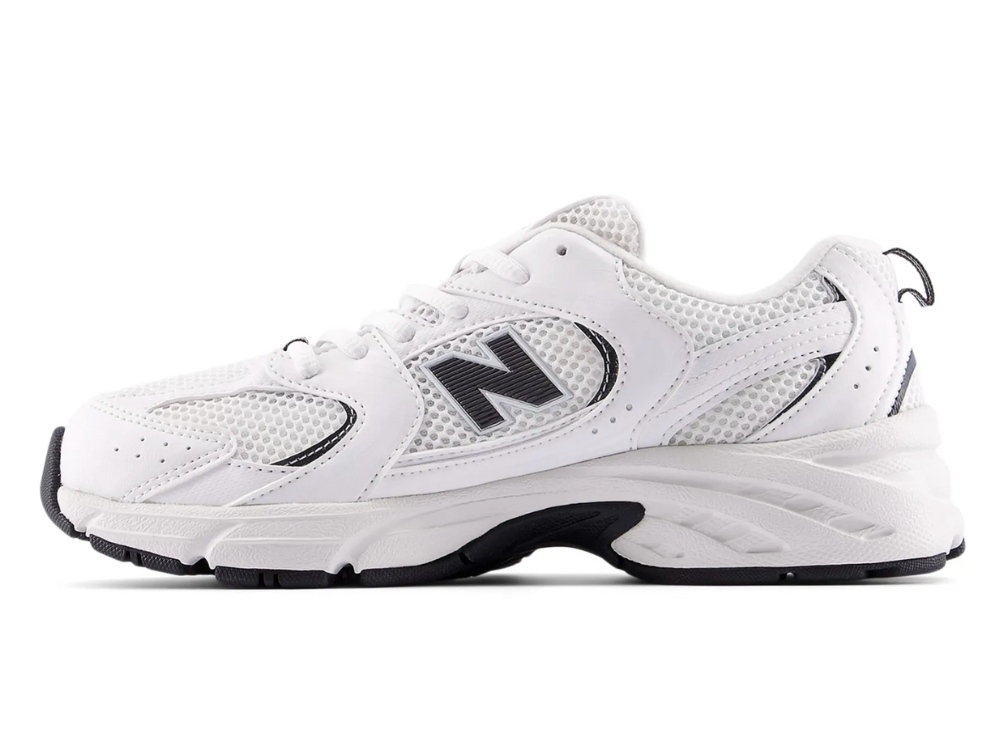 New Balance 530 sneaker i reflection/black cement farve vist fra sidenTopbillede af New Balance 530 sneaker med elastiksnørebåndNew Balance 530 sneaker til børn i hvid med sorte detaljer set skråt forfra