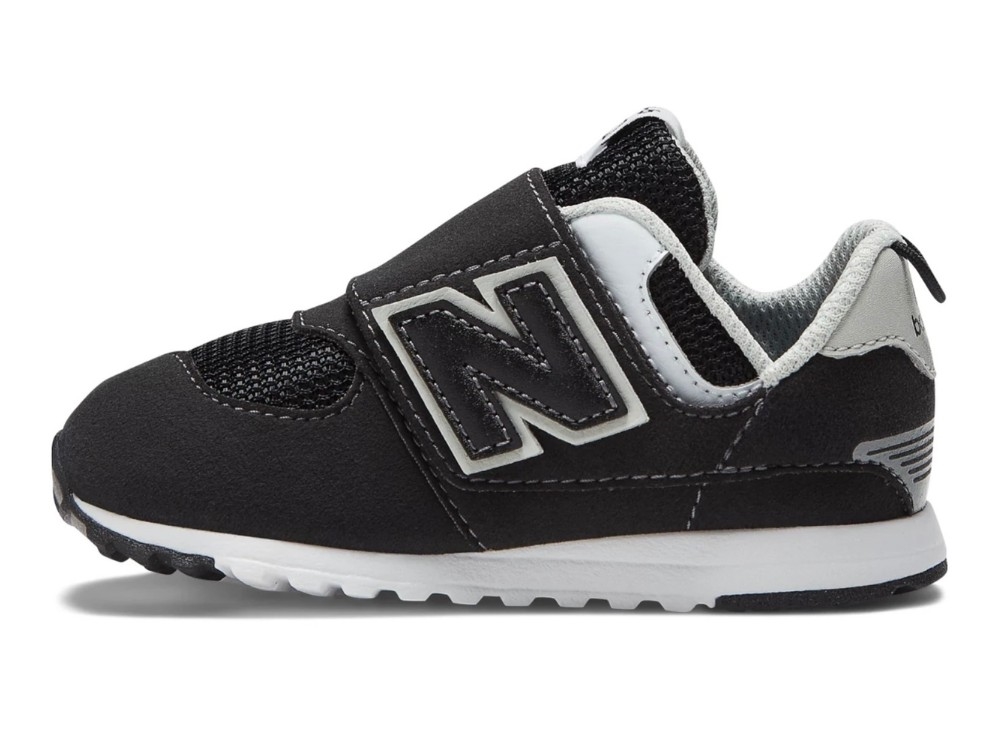 Bred sneaker i sort fra New Balance med praktisk velcrolukning, designet til de mindste børn, der er ved at tage deres første skridt. Modellen kombinerer et klassisk 574-design med en fleksibel og stabil opbygning, der støtter barnets fod i hverdagen.