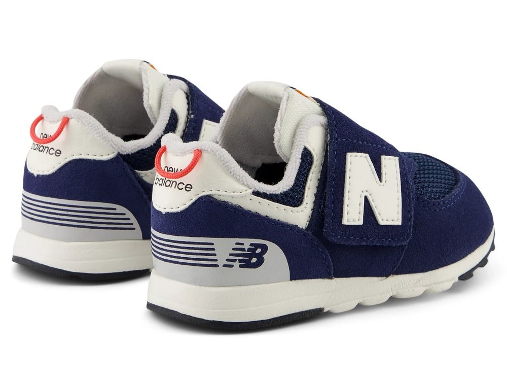 Blå sneakers med røde, grå og råhvide detaljer (nb navy blast red) fra New Balance med velcrolukning.