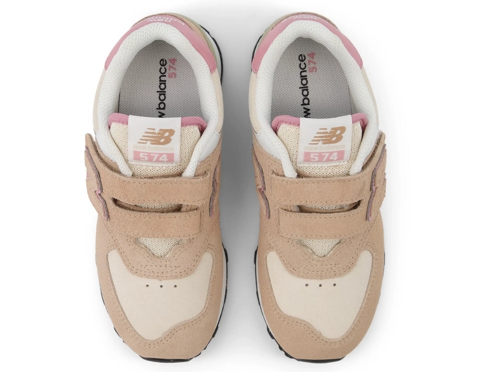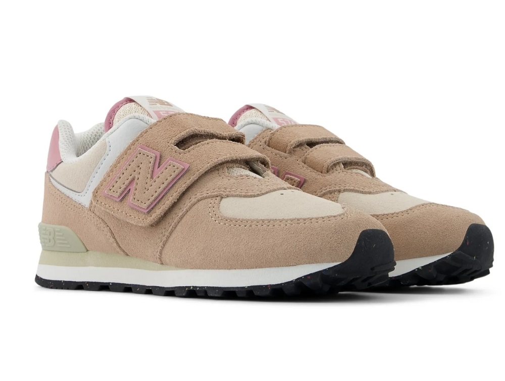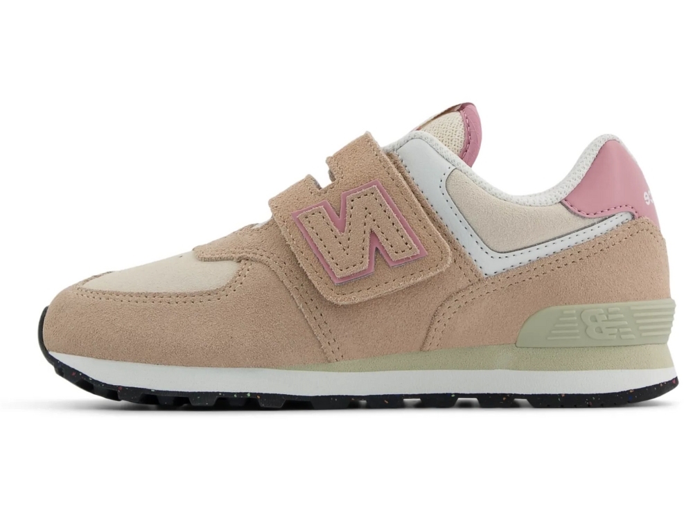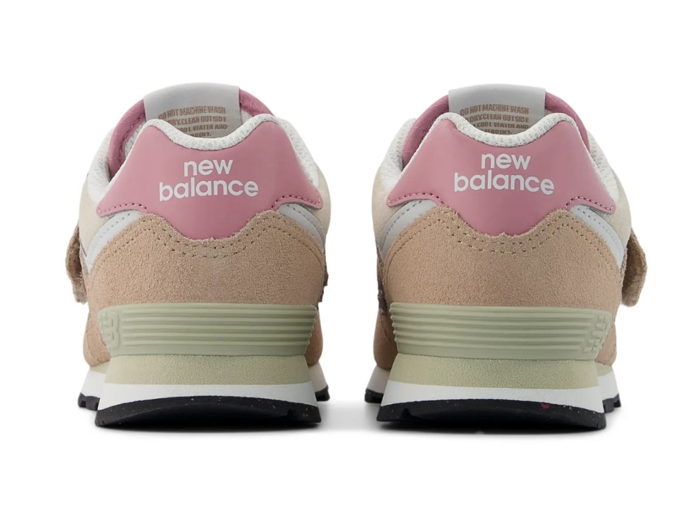 Sneakers i beige og rosa nuance (flat taupe/pink taffy) fra New Balance med velcrolukning og klassisk 574-design.
