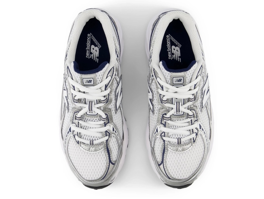 Sneaker med sølv, hvide og mørkeblå detaljer fra New Balance med klassisk snørelukning, der giver en justerbar og stabil pasform. Modellen er udviklet til større børn og kombinerer et sporty udtryk med komfortabel opbygning til hel dags brug.