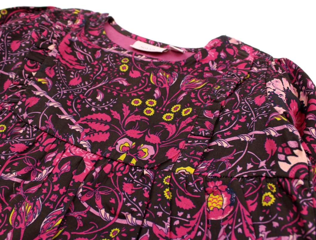 Brun kjole med blomsterprint og trykknapper ved skulder fra Noa Noa Miniature.