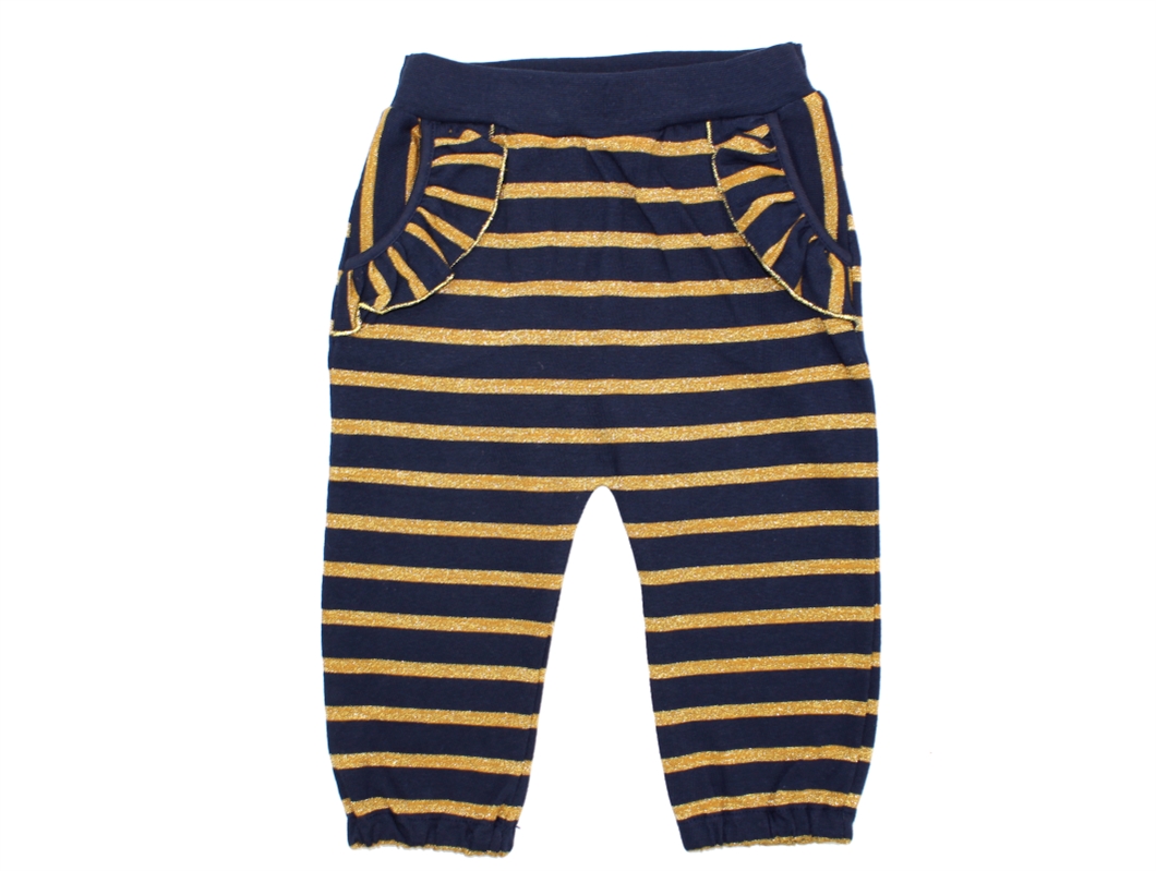 Blå sweatbukser med guldfarvede striber og flæser på lommerne fra Noa Noa Miniature.