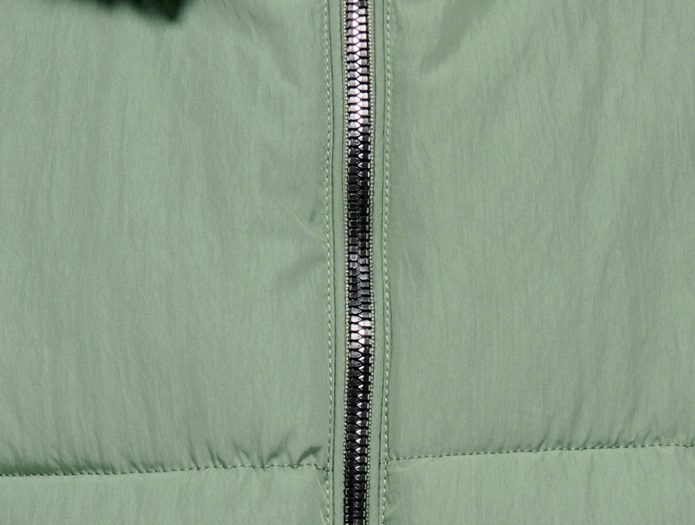 Jakken er fremstillet i en blanding af nylon og genanvendt polyester, hvilket giver en slidstærk overflade, der samtidig er nem at vedligeholde. Fyldet sikrer varme uden at gøre jakken tung, og den faste hætte beskytter mod vind og kulde.